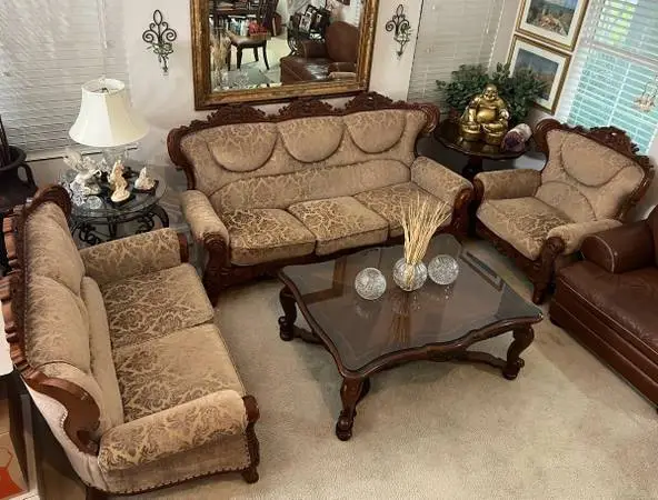 Elegant and timeless 3-piece European-style living room set with carved wood accents and upholstered seating. This classic design adds a luxurious feel to any living room or sitting area. ***THE CUSHIONS NEED RESTORING. No rips or tears in the fabric but some cushions have springs that are out of place, restoring and replacement padding is necessary.*** This set is ideal for someone who appreciates vintage furniture and doesn’t mind putting a little work into restoring the cushions. Realtors and Stagers; this set would be great for staging a home for sale. Set includes: • 1 Large Couch/Sofa • 1 Loveseat • 1 Armchair Dimensions: • Couch: 90 W x 37 D x 43 H • Loveseat: 64 W x 37 D x 43 H • Chair: 45 W x 37 D x 43 H • Upholstered in a traditional European-style fabric floral print • Beautiful carved wood detailing throughout • Sturdy and well-made — perfect for classic or vintage-inspired interiors ***Pickup Only, NO DELIVERIES.*** Located in Eastvale, near Ontario (off 15 freeway and Limonite) Serious inquiries only, please. Feel free to message with any questions or to schedule a viewing!