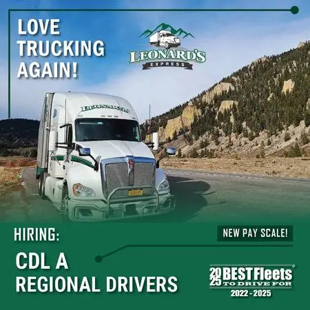 Regional Drivers • New Top Pay • Home Time Options • 4 X Best Fleets Winner! Leonard’s Express is a 4-time Best Fleets to Drive For winner, chosen and voted on by the people who matter most: our drivers. We were built on 1 simple principle: Do the Right Thing. Here, drivers are our most valuable asset—not a number. If you’re ready to be treated and PAID like a true professional and appreciated for the work you do, this is the place to be. PayTop CPM Regional CDL Pay: 0250 Mile Loads: $0.80 CPM 251500 Mile Loads: $0.70 CPM 501 Mile Loads: $0.60 CPM PLUS $25 for Every Live Load or Unload Home Time: Northeast Regional Drivers: Home every weekend Atlantic Coastal Regional Drivers: 75 of weekly home time is on weekends New Top Pay • Top-of-the-Line Equipment • Latest Technology Benefits & Features: Per Diem Pay Optional Health, dental, vision, and life insurance Paid Time OffPTO& holiday pay 401 K with company match Weekly Direct Deposit No Touch Fr 8 ISAAC, ELOG, EZPASS, PREPASS Late Model Equipment Paid Orientation Full-Service Terminals and 24/7 Dispatch & Road Service Pet and rider policy Satellite radio in all trucks It’s not just a seat. It’s a home. It’s not just a load. It’s a future. It’s time to love trucking again. RequirementsClass A CDL: 6 months OTR experience required Must be 21 or older APPLY NOW: https://drive 4 leonards.com Call: 585-869-3108 SEO Keywords: CDL jobs, Class A truck driver, regional CDL driver, trucking jobs PA, Harrisburg trucking jobs, Northeast regional trucking, OTR driver jobs, high CPM trucking, home weekly CDL, Best Fleets to Drive For, Leonard’s Express jobs, no touch fr 8, late model trucks, driver‑focused carrier.