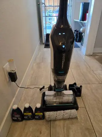 BISSELL CrossWave Cordless Max All in 1 Wet-Dry Vacuum Cleaner and Mop for Hard Floors and Area Rugs, Black, 2554 • Brush System: Rotating. Cleaning Path Width: 10.5. Swivel Head: Yes. Carry Handle: Yes. Clean Tank Capacity: Water Tank - 28 oz | Dirt Tank - 18.6 oz • VACUUM & WASH AT THE SAME TIME. Combine floor cleaning chores with cordless freedom. • 36 V LITHIUM-ION BATTERY. Provides up to 30 minutes of cordless cleaning power. • IMPROVED EDGE CLEANING. Easily pick up pet hair that gathers along baseboards and in corners of your home. • SELF-CLEANING CYCLE. Maintain your machines cleaning performance. • MULTI-SURFACE CLEANING. Safe and effective for use on tile, sealed wood floors, laminate, linoleum, rubber floor mats, pressed wood floors, and more. It even refreshes area rugs Comes with extra brush roller and 3 starter bottles of Bissell floor cleaner. Asking $150.00 or reasonable offer. Cash only. For local Pick up. Please . I will not respond to emails of text asking us to email you back at a personal emails address.