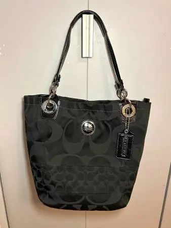 *100% AUTHENTIC COACH BAG* EXCELLENT OUTSIDE CONDITION LARGE COACH ALLOVER C LOGO SHOULDER BAG W/ BLACK PATENT LEATHER STRAPS (lining has some markings on it, see photos)... DETAILS: LEATHER STRAPS W/ OVERSIZE METAL GROMMETS, BACK OUTSIDE LARGE POCKET W/ MAGNETIC CLOSURE, LARGE INSIDE ZIPPERED POCKET, 2- POUCH INTERIOR POCKETS... COLOR: BLACK JACQUARD CANVAS/ BLUE TAFFETA LINING... MODEL: D1249-20884M... DIMENSIONS: 9.5 W X 12.5 H X 6 D... THIS IS CASH SALE ONLY. NO E-TRANSFER... PRICE IS NON-NEGOTIABLE & NOT TRADABLE... FEEL FREE TO EMAIL ME WITH YOUR QUESTIONS AND I WILL GET BACK TO YOU ASAP.. ALL SALES ARE FINAL... ***PLEASE DO NOT ASK FOR A LOWER PRICE & ALL PURCHASES MUST BE PICKED UP AT MY LOCATION. I WILL NOT MEET TO DELIVERY OR SHIP THE ITEM.*** PLEASE CHECK OUT MY OTHER ITEMS FOR SALE BY CLICKING ON MORE ADS BY THIS USER...