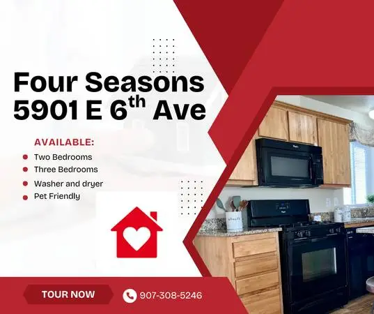 Four Seasons - A place to call home! Bed: 2 / Bath: 2 Sq. Footage: 1025 sq ft Rent: $1899/Month Terms: 10-Month, 11-Month, 12-Month Call for details: Leasing office located on Driftwood New 2 and 3 bedroom manufactured homes with 2 full bathrooms ready and waiting for you. Homes are approximately 1025 square feet of living space. Each home comes with granite counter tops in kitchen and baths. Enjoy taking advantage of your own full size washer and dryer! Four Seasons is a pet friendly community and we look forward to meeting your furry family members. The community is conveniently located close to Glenn Highway, military bases, shopping and entertainment. Spacious 2-bedroom 2-bath split open floor plan Our Apartment Homes Feature: ◾ Cable Ready ◾ Dishwasher ◾ Hardwood Floors ◾ Heating ◾ Microwave ◾ Oven ◾ Refrigerator ◾ Tub/Shower ◾ Washer/Dryer ◾ Built-in microwave ◾ Double Sinks ◾ Gas Stoves ◾ Marble counter tops Our Residents Enjoy: ◾ Accepts Electronic Payments ◾ Close to Shopping and Entertainment ◾ Clubhouse ◾ Courtesy Patrol ◾ Dining Nearby ◾ Maintenance on site ◾ Onsite Management ◾ Pet Friendly ◾ 1 mile to Joint Base Elmendorf Richardson ◾ 24-Hour Emergency Maintenance ◾ Close to Glenn Highway ◾ Local Schools: Bartlett High School, Clark Middle School and Ptarmigan Elementary School ◾ Online Rent Payment ◾ Online Service Requests ◾ Washer & Dryer In Unit Call for details: 5901 E 6th Ave. Office Anchorage, AK 99504 Website: www.apts-rental.com?n=four_seasons&rp=j5fduzsdyx&t=wb Mon - FRI: 10:00 AM - 6:00 PM Pets: Breed Restriction No Weight Restrictions Limit to 2 pets. No weight limit. Certain breed restrictions apply. Along with our income and credit requirements, we do not automatically exclude rental applicants based on criminal history. Any criminal history will be evaluated in consideration of when the crime occurred, what the underlying conduct entailed and/or what the rental applicant has done since the conviction. Prices and availability subject to change EQUAL HOUSING OPPORTUNITY 21A39914E5274A7C